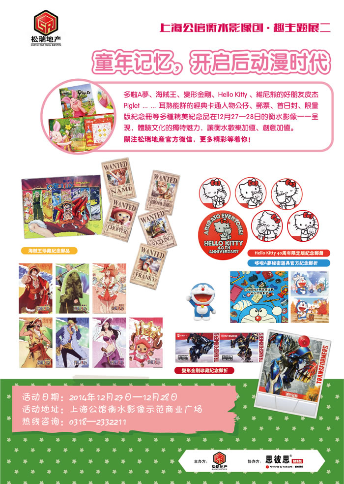 这一切就在12月27-28日的上海公馆衡水影像示范广场,由衡水松瑞房地产开发有限公司主办、思彼思协办的巴布熊猫与动漫邮票创•趣主题展。