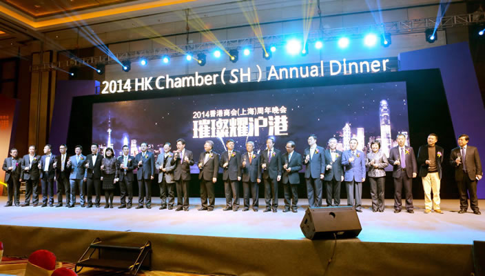 “璀璨耀沪港”2014中国香港(地区)商会—上海周年晚宴于周六在上海浦东嘉里大酒店隆重举行。当晚嘉宾云集,当晚嘉宾云集,星光熠熠,来自沪港政界领导、商界精英与商会会员近500多位济济一堂,共襄盛会。