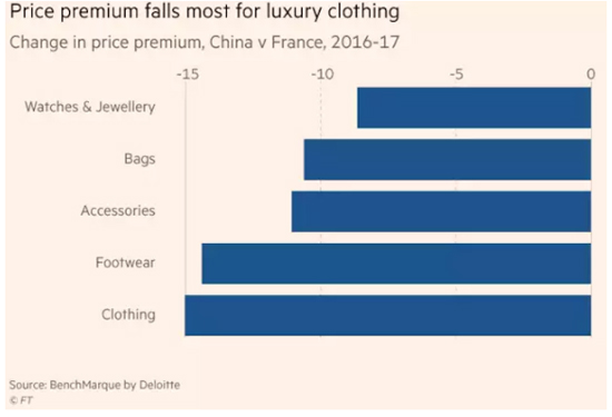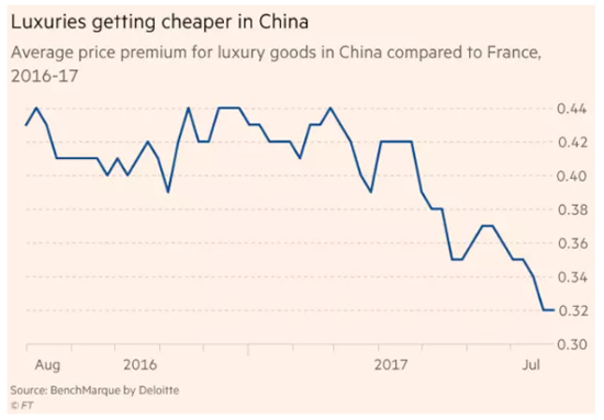 2016 年至 2017 年奢侈品在中国的溢价变化,图片来自《金融时报》